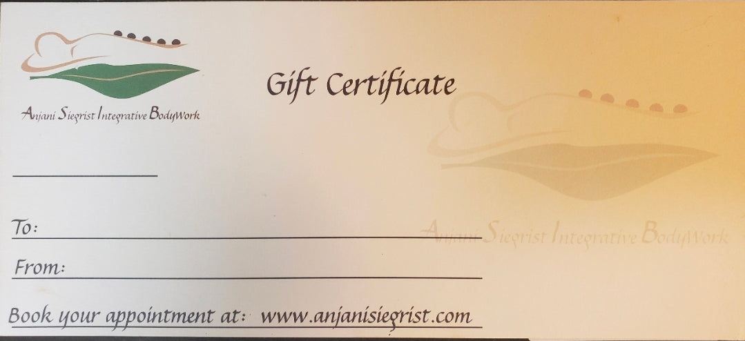 Treat someone you care about to a truly transformative experience with a gift certificate from Anjani Siegrist Integrative Bodywork — where healing meets intuition, expertise, and heartfelt care. Whether it’s for relaxation, relief from tension, or whole-body renewal, these gift certificates open the door to an experience clients describe as the best massage ever — leaving them glowing, grounded, and buzzing with well-being long after their session ends.